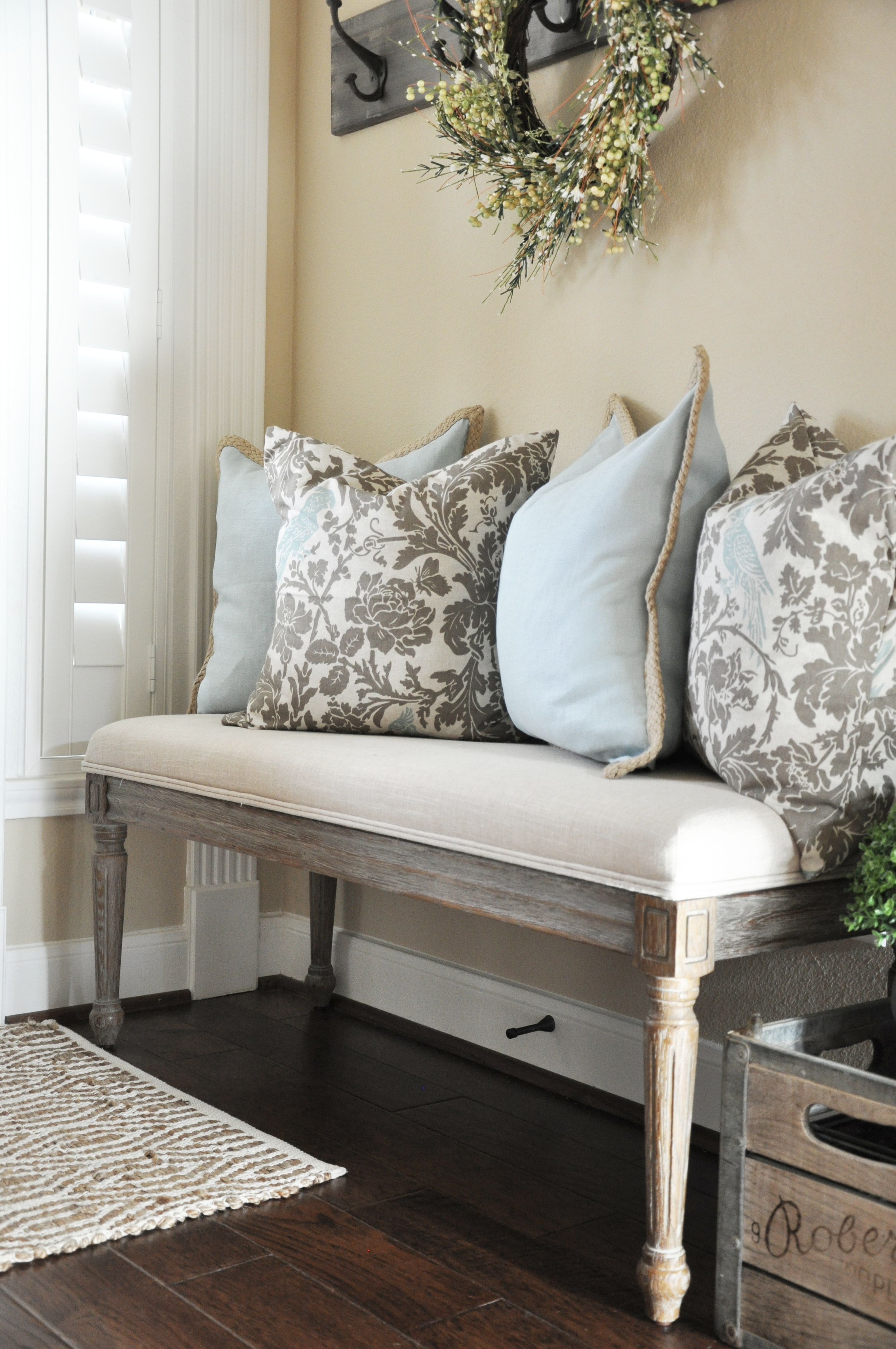 If you've spent any time looking at my Instagram posts, you know that my entryway is one of my favorite places to decorate and redecorate. One of the questions I always get is where I found my bench. The bench actually came from World Market. I know you're picking yourself up off the the floor right now after the shock that it didn't come from Laurie's. I digress. Anyway, back to the bench. It is the Natural Linen Paige Bench SKU# 490231. It's seriously the perfect little bench, and it is reasonably priced to boot. Who doesn't love that?!